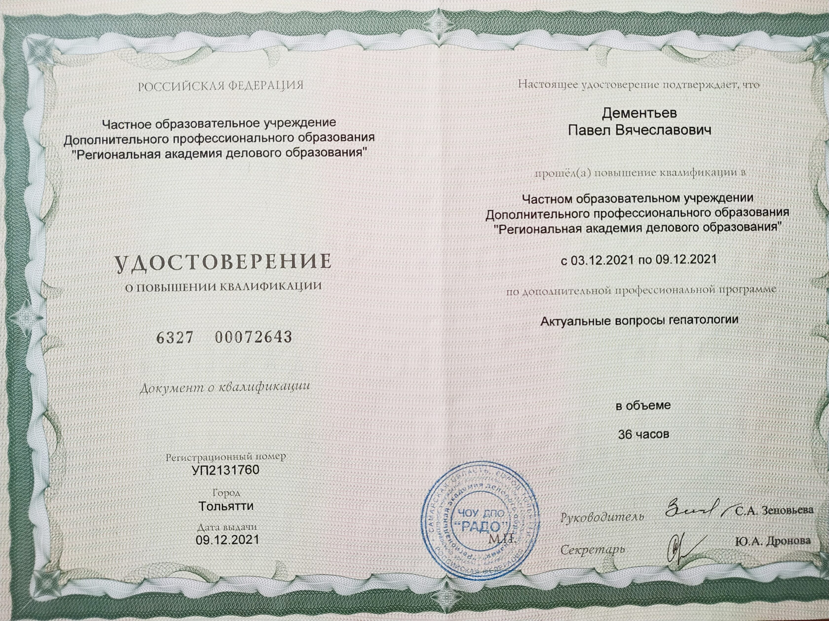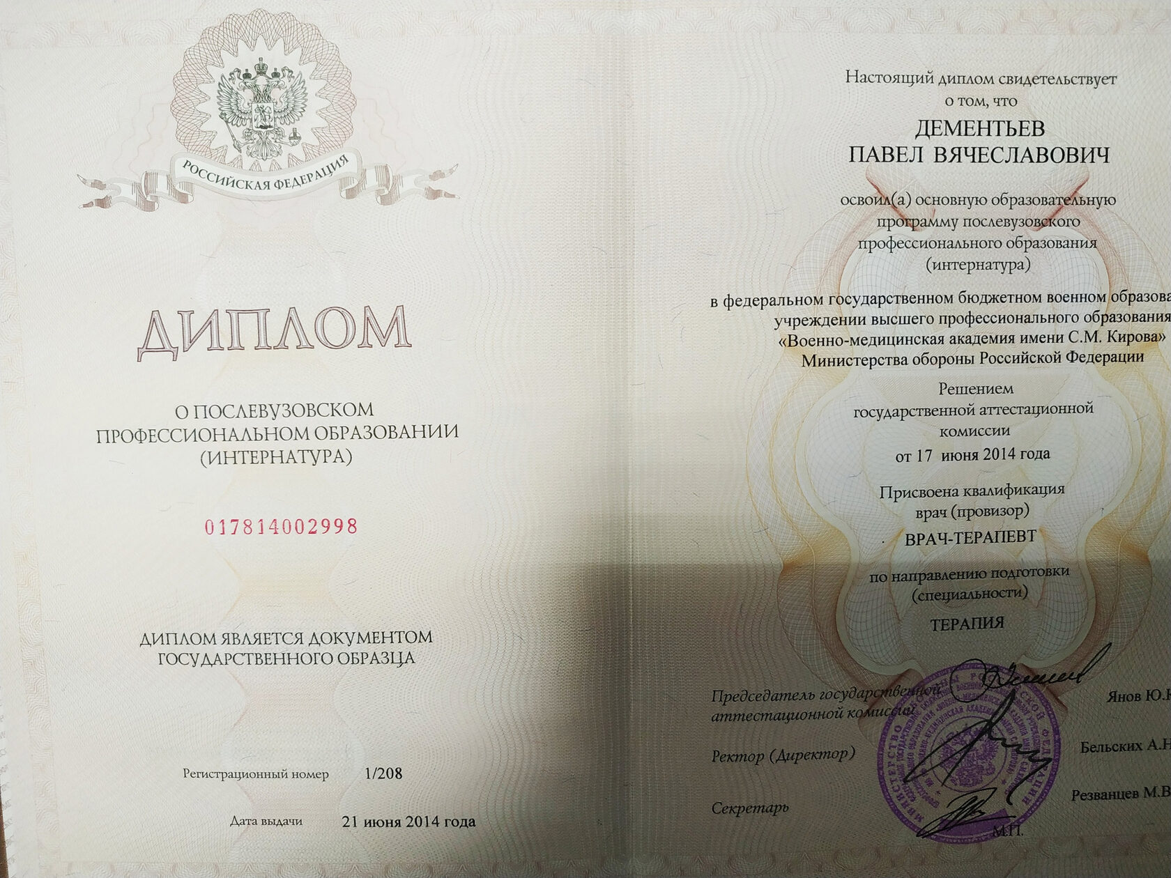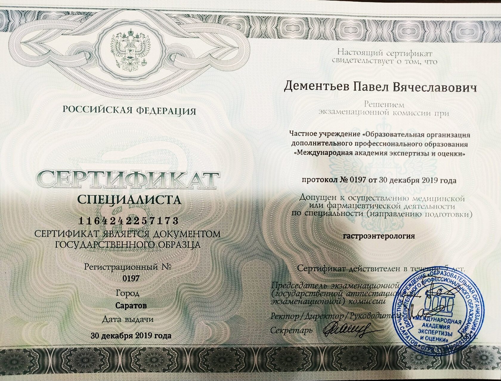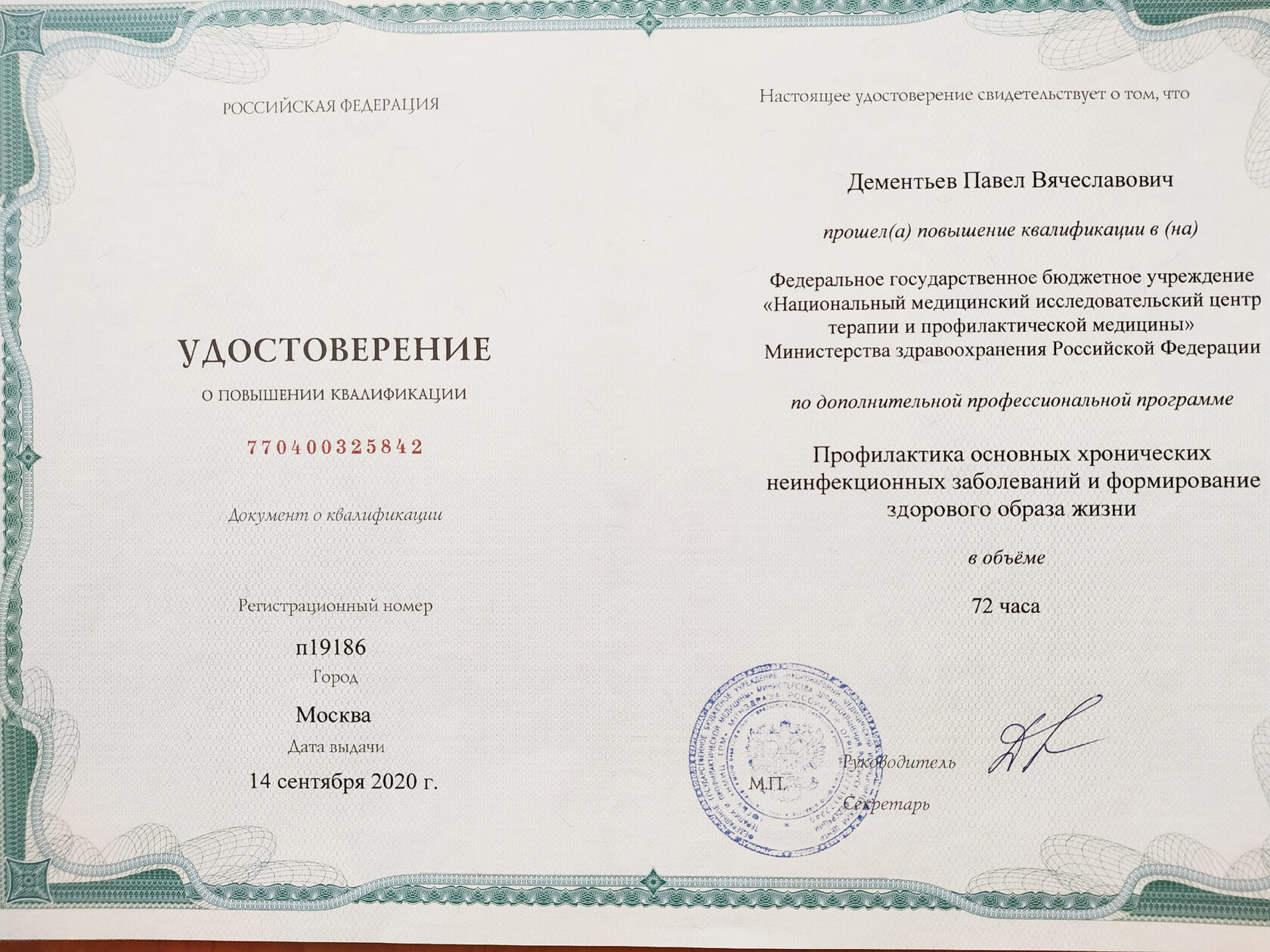 Дипломы и сертификаты врача Павла Дементьева